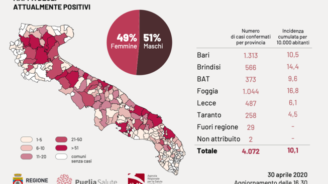 Il totale dei 4072 casi totali riscontrati, su un campione di 62.460 tamponi, è così diviso: