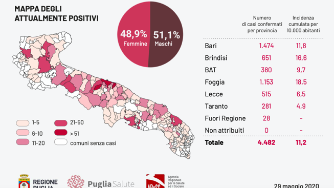 Il dato complessivo di casi riscontrati in Puglia di Coronavirus, dunque, è di 4.482 (su 114.588 test) così suddivisi: