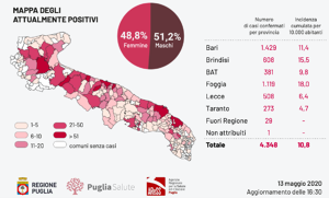 Il totale dei casi positivi Covid in Puglia, dunque, è di 4.348 (su 83.713 test), così divisi: