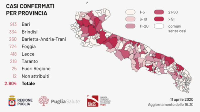 Il totale dei casi positivi Covid in Puglia è di 2.904. Così divisi: