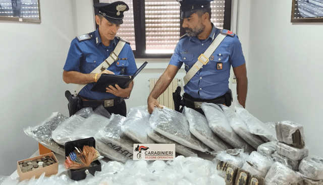 A Taviano, in casa di un 50enne, i Carabinieri hanno trovato nascosti in due borsoni, occultati vicino al muro di cinta esterno dell’abitazione, 11 kg di marijuana, 7 kg di hashish e quasi 1 kg di cocaina.