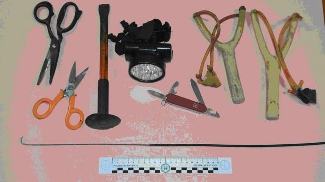 Nella macchina, inoltre, vengono trovati e sequestrati altri oggetti atti allo scasso, ovvero: una forbice da sarto di colore nero con le punte modificate posta sotto il sedile; all’interno del bagagliaio erano riposti in una borsa di plastica due fionde in legno con relativo elastico, un temperino multiuso ed una torcia frontale di colore nero mentre, nel vano ruota di scorta, si rivelava la presenza di uno scalpello in ferro di colore rosso con impugnatura in plastica ed un filo metallico da carrozziere della lunghezza di circa 80 cm con l’estremità ricurva. Attrezzo verosimilmente utilizzato per aprire le portiere di autovetture dall’esterno.