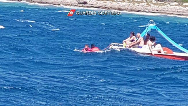 A tali richieste di soccorso le Sale Operative della Guardia Costiera interessate hanno risposto impiegando le motovedette in dotazione. Quindi, nei pressi dell’Isola dei Conigli di Porto Cesareo una motovedetta ha tratto in salvo quattro persone a bordo di in un pedalò alla deriva, che si stava pericolosamente allontanando dalla costa.