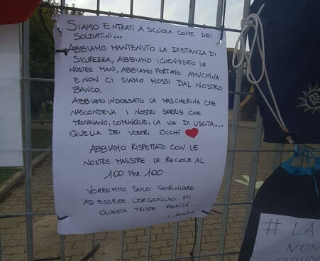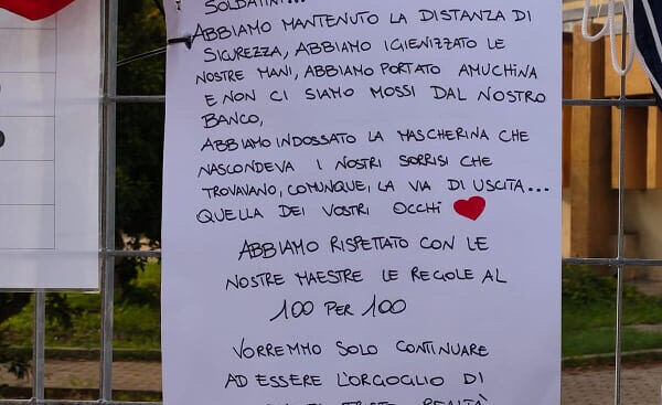 «Siamo entrati a scuola come soldatini. Abbiamo mantenuto la distanza di sicurezza, abbiamo igienizzato le nostre mani, abbiamo portato Amuchina e non ci siamo mossi dal nostro banco. Abbiamo indossato la mascherina che nascondeva i nostri sorrisi che trovavano, comunque, la via di uscita…quella dei nostri occhi. Abbiamo rispettato con le nostre maestre le regole al 100 per 100. Vorremmo solo continuare ad essere l’orgoglio di questa triste realtà» si legge.