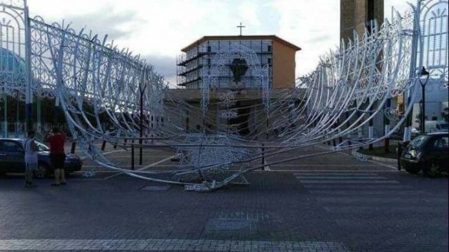 Nuvoloni all'orizzonte, qualche timido accenno di pioggia, ma soprattutto tanto, tantissimo vento. E non si parla di una flebile brezza estiva. Le raffiche sono state forti al punto da abbattare alcune delle luminarie erette a Corsano in occasione dell'imminente Festa di San Biagio, patrono del grazioso paese salentino situato a pochi passi da Tricase. Per i cittadini questa celebrazione significa molto e vedere a terra parte dell'enorme struttura (posizionata davanti alla Chiesa) deve sicuramente aver causato timore. Risulta soprattutto la parte superiore quella maggiormente danneggiata, mentre invece i pali che fungono da pilastro non hanno registrato particolari modifiche. I più attenti ricorderanno, inoltre, che un episodio del genere accadde anche a settembre 2014, ma a Copertino. Nella circostanza, infatti, crollarono alcune costruzioni in onore di San Giuseppe, il "santo dei voli".