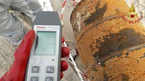 Cosa conteneva restava, a prima vista, ignoto. Per questo motivo, con il prezioso aiuto di una strumentazione campale ad hoc, i Vigili del Fuoco hanno effettuato delle rilevazioni nelle immediate vicinanze del fusto, al fine di verificare l’assenza di rischio e/o contaminazione radiologica esternamente allo stesso. O ancora, l’eventuale fuoriuscita di materiale liquido o solido. Insomma, nulla è stato lasciato al caso.