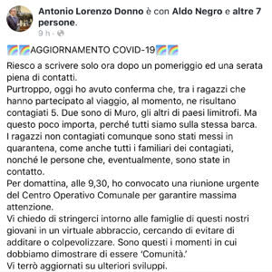 A ufficializzare la positività dei due cittadini muresi lo stesso sindaco del comune, Antonio Lorenzo Donno con un post su facebook: “Riesco a scrivere solo ora dopo un pomeriggio ed una serata piena di contatti.
