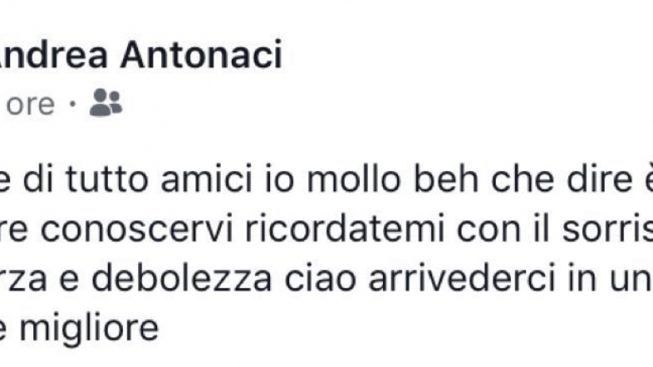 “Mi dispiace di tutto amici io mollo beh che dire è stato un piacere conoscervi ricordatemi con il sorriso e con la mia forza e debolezza ciao arrivederci in un’altra vita forse migliore”, queste le sue parole affidate al social network.