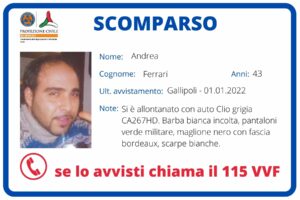 Dalla giornata dell’1 gennaio, infatti, non si hanno più notizie di Andrea Ferrari, 43enne di Taviano, che si è allontanato dalla sua abitazione a bordo di una Renault Clio, targata CA267HD, di colore grigio. Non vedendolo tornare a casa la madre con cui l’uomo vive, ne ha denunciato la scomparsa.