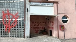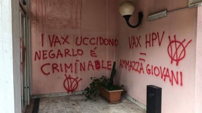 “I vaccini uccidono”, “i vax uccidono, negarlo è criminale”, “Troppi malori improvvisi. Lo Stato tace che sono dai vax uccisi”. Sono solo alcune delle scritte comparse nella notte sui muri della sede della Asl di Maglie che si affaccia su via Sante Cezza, dove è ospitato peraltro il centro vaccinale. Ma i no-vax che hanno firmato i messaggi con della vernice spray rossa hanno imbrattato anche le auto dell’azienda sanitaria, parcheggiate nel piazzale. Una volta scoperto il raid vandalico, sono stati ‘informati’ i Carabinieri della locale compagnia, ora impegnati a risalire ai responsabili del gesto. Nelle mani degli uomini in divisa sono finiti i filmati delle telecamere di sicurezza, di cui la sede è munita, nella speranza di poter trovare nei frame qualche indizio per dare un volto e un nome agli autori delle scritte. Le indagini sono in corso.