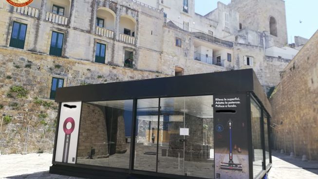 Superata la Porta Alfonsina, nel cuore del centro storico di Otranto, era impossibile non “notare” quella struttura mobile, in laminato e vetro, utilizzata per promuovere i prodotti di una nota un’azienda inglese, leader nella progettazione di elettrodomestici.