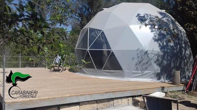 Al momento del sopralluogo, è stata accertata la realizzazione di un prefabbricato di forma sferica e con diametro pari a 8 metri circa, installato su una piattaforma di legno con intelaiatura metallica ancorata al suolo.