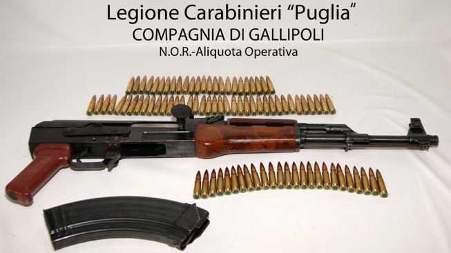 Una vigilia di Natale movimentata per militari del Nucleo Operativo della Compagnia Carabinieri di Gallipoli. Questi, infatti, nel corso di un più ampio servizio di Polizia Giudiziaria finalizzato alla ricerca di armi e munizioni presso il Condominio dove gli stessi operatori, lo scorso 3 Dicembre 2016, catturarono Marco Barba alias “Tannatu”, hanno rinvenuto e sequestrato a carico di ignoti un fucile automatico kalashnikov in perfetto stato di conservazione con ben 87 munizioni cal. 7,62 x 39, di cui 25 all’interno del caricatore a banana e 62 in una busta in plastica. Qui, ovviamente, va fatta una precisazione: il sequestro odierno è scattato a carico di ignoti. Non si può accusare Barba di nulla, né tantomeno è possibile – fino a prova contraria – ipotizzare alcun collegamento.