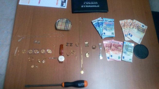 Dagli accertamenti si è poi scoperto che gli oggetti in oro altro non erano che il bottino di un furto consumato nel medesimo pomeriggio in una abitazione poco distante dal luogo in cui è stato arrestato. Tutta le refurtiva, riconosciuta dai legittimi proprietari, è stata a loro restituita.