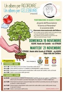 Per il secondo anno consecutivo torna l’iniziativa “Un albero per ricordare… un albero per celebrare”, organizzata dal “Sorriso di Pierandrea”. L’associazione, in occasione della giornata internazionale dell’albero, piantumerà 13 alberi (cercis, melograni e bagolari): 6 nelle aiuole del Castello di Acaya e sette nelle aiuole della scuola elementare di Strudà. Inoltre riqualificherà, piantumando 350 piante, la siepe del viale del cimitero di Strudà, che oggi versa in pessime condizioni.