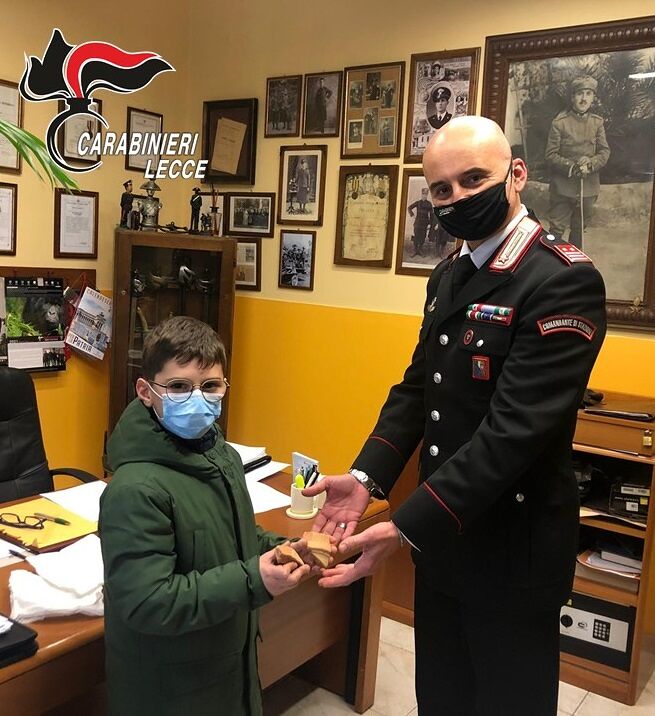 I pezzi riportavano incise delle lettere e avendo avuto modo di apprezzare nelle visite al Museo del mare e a quello della Preistoria l’importanza dei reperti, il piccolo ha deciso di portarli al Comandante della stazione dei Carabinieri del suo paese affinché gli esperti possano esprimersi sul loro valore e metterli eventualmente a disposizione della comunità.