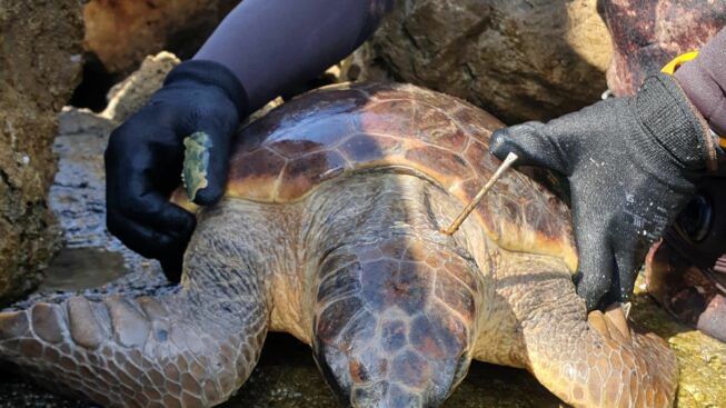 L’esemplare è stato recuperato grazie al lavoro di squadra di un sub amatoriale e di un pescatore all’imboccatura del porticciolo di Torre Vado. Una volta fuori dall’acqua, la scoperta. La sfortunata tartaruga aveva un grosso ferro conficcato nel collo, che ne impediva il movimento naturale.