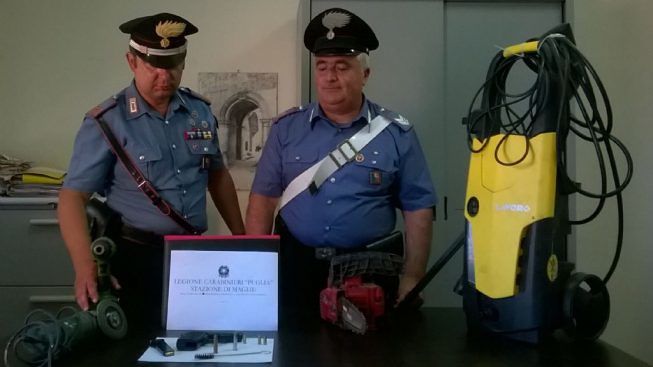 Nel corso dell’attività di polizia giudiziaria sono stati rinvenuti e sottoposti a sequestro una motosega, un avvitatore elettrico a batteria, una smerigliatrice angolare ed un’ idropulitrice, tutto risultato provento di un furto consumato il 27 giugno scorso a Scorrano, ai danni di un 40enne del posto che, immediatamente dopo il sequestro, ha riconosciuto la refurtiva.