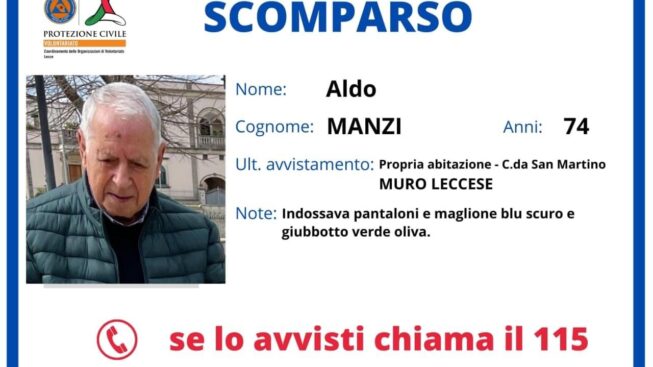 Le ricerche di Aldo Manzi, 74enne di Muro leccese scomparso nel nulla si sono concluse nel peggiore dei modi. Il corpo dell’uomo è stato ritrovato senza vita in una campagna di sua proprietà, dove si era recato per raccogliere asparagi. Era uscito quando le lancette dell’orologio avevano da poco segnato le 14.30, ma non a casa è non mai tornato tant’è che la figlia, preoccupata aveva chiesto aiuto agli uomini in divisa che, una volta formalizzata la denuncia, avevano dato il via alle ricerche partendo proprio dal terreno tra la Contrada San Martino e la Contrada Maccallè, dove il 74enne era solito andare.