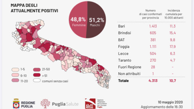 Il totale dei casi positivi Covid in Puglia, quindi, è di 4.313 (su 78.399 test eseguiti) così divisi: