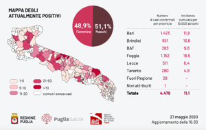 Il dato complessivo di casi riscontrati in Puglia di Coronavirus, dunque, è di 4.479, così suddivisi: