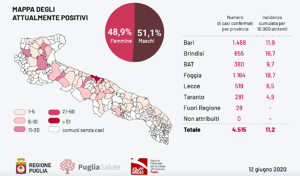 Il totale dei casi positivi Covid in Puglia dall’inizio dell’emergenza è di 4.515 (su 143.844 test), così divisi:
