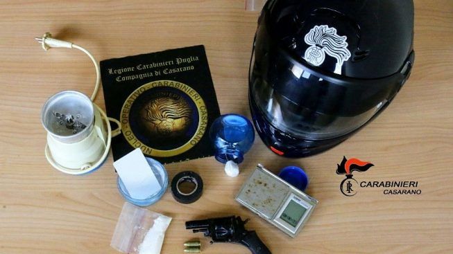 In un pensile della cucina erano stati nascosti quattro dosi di cocaina da un grammo ciascuna. E ancora un bilancino di precisione e tutto il materiale utilizzato per il confezionamento delle dosi. Ma la sorpresa più grande è spuntata fuori dall’armadio del bagno dove è stata rinvenuta una pistola di tipo revolver, carica, funzionante, priva di matricola, con all’interno 2 munizioni calibro 9X21.