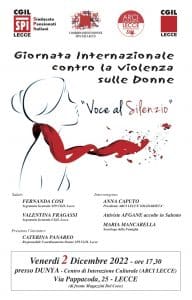 È previsto per domani pomeriggio l’appuntamento che dà “Voce al Silenzio”, un evento organizzato da Spi-Cgil Lecce in occasione della giornata internazionale contro la violenza delle donne, che si è celebrata lo scorso 25 novembre. A partire dalle 17.30 di domani 2 dicembre, infatti, il Centro di interazione culturale “Dunya” di Lecce ospiterà la manifestazione a cui hanno collaborato il Coordinamento Donne del Sindacato dei pensionati italiani di Lecce, la Cgil territoriale e Arci Lecce Solidarietà.