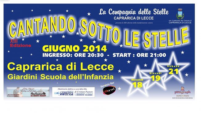 “Cantando sotto le stelle” non è solo musica, è un evento a 360gradi per tutti i gusti, anche i più raffinati. E se è giunta quest’anno alla sua 13esima edizione qualcosa vorrà pur dire. Forse che l’intuizione è quella giusta: chi sale sul palco di “Cantando” da sempre canta e incanta, urla e stona, comunque consapevole di essersi guadagnato un grosso applauso dal nutrito pubblico! E non c’è formula vincente che tenga di fonte ad una risata genuina e sana.