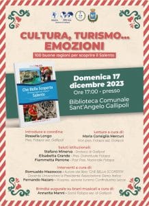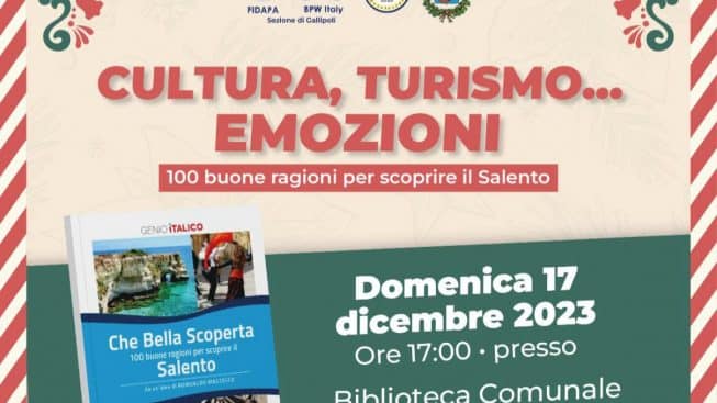 Per scoprire il Salento ci sono cento buone ragioni…e forse anche di più. Tutto sta nel saperle raccontare con gusto e leggerezza al punto da indurre il lettore a trasformarsi in visitatore. In fondo il turismo parte proprio da qui, da una forte motivazione a viaggiare, a scoprire un territorio che non si conosce. Stimolare la curiosità a conoscere prima e a raggiungere poi il Salento è un’ arte che riesce bene a Romualdo Mazzocco, docente universitario e presidente dell’ associazione Genio Italico che presenterà il suo ‘Che Bella Scoperta‘ in occasione dell’ evento ‘Cultura, Turismo… Emozioni’ che si terrà domenica 17 dicembre, alle ore 17.00, presso la Biblioteca Comunale ‘Sant’Angelo’ di Gallipoli.