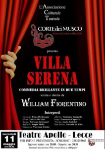Dopo il successo dello scorso 1 aprile, torna in scena la Commedia brillante “Villa serena” in due tempi al Teatro Apollo di Lecce. Lo spettacolo è previsto per il prossimo 11 maggio, ore 20:30. In collaborazione con APMARR e AMA Lecce, l’incasso netto della vendita dei biglietti sarà devoluto alle due associazioni.