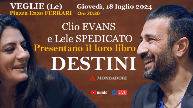 Si svolgerà giovedì 18 luglio, alle ore 20:30, piazza Enzo Ferrari a Veglie la presentazione del libro “Destini”, edito da Mondadori e scritto a quattro mani da Clio Evans e Lele Spedicato.