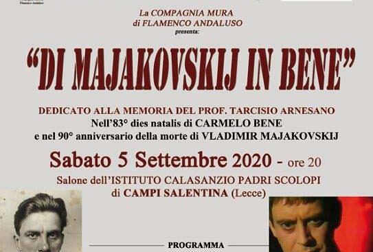 Si svolgerà domani, sabato 5 settembre, a partire dalle ore 20, presso il salone dell’Istituto Calasanzio Padri Scolopi di Campi Salentina, l’evento “Di Majakovskij in Bene”, organizzato dalla Compagnia Mura di flamenco andaluso di Lecce, con il patrocinio, tra gli altri, della Provincia di Lecce, nell’anniversario della nascita di Carmelo Bene (83°) e nel 90° anniversario della morte di Valdimir Majakovskij. L’evento è dedicato alla memoria di Tarcisio Arnesano, amico d’infanzia di Carmelo Bene, scomparso recentemente