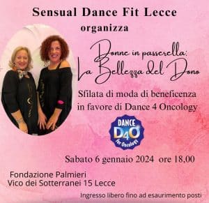 Nasce da qui l’evento ‘Donne in passerella: la bellezza del dono‘, organizzato dal team di “Sensual Dance Fit” di Lecce nella giornata di sabato 6 gennaio 2024, nel capoluogo salentino, presso la Fondazione Palmieri in Vico dei Sotterranei 15, alle 18.00.