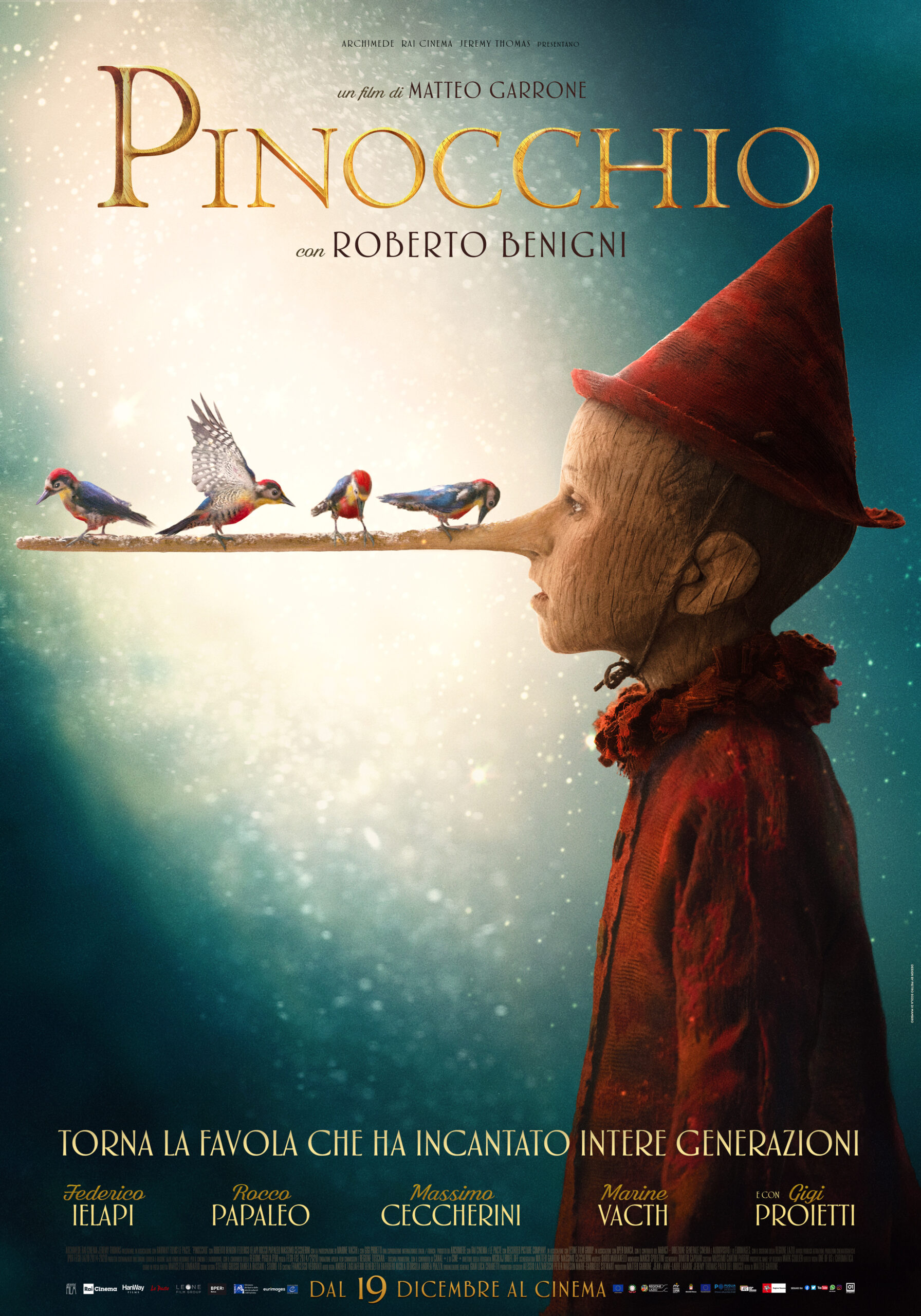 Di generazione in generazione, la storia del burattino di legno dal naso lungo ha affascinato grandi e piccini, ed ancora una volta metterà d’accordo tutti i membri della famiglia che decideranno di andare al cinema durante le vacanze di Natale. Da giovedì 19 dicembre l’atteso Pinocchio di Matteo Garrone torna nelle sale italiane, con protagonisti Roberto Benigni nei panni di Geppetto, Rocco Papaleo e Massimo Ceccherini nei panni del Gatto e della Volpe, Gigi Proietti che recita Mangiafuoco ed il giovane Federico Ielapi nei panni di Pinocchio.