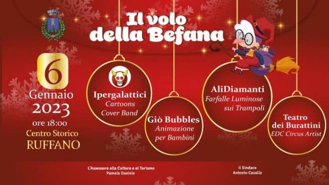 La Befana sarà a Ruffano già dal 4 gennaio dove accoglierà i bimbani che vorranno incontrarla nella Casetta degli Elfi, tra le vie del centro storico attorno a Piazza del Popolo.