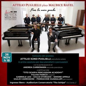 Alle 18.00, sempre presso il Conservatorio, Attilio Igino Puglielli, direttore artistico del Festival, si esibirà in un’attesissima performance in cui eseguirà il Concerto per mano sinistra di Maurice Ravel, insieme ad Andrea Carbonara al secondo pianoforte e all’ensemble “Tito Schipa Percussion Academy” formata da Fulvio Panico, Gabriele Leo, Giulio D’Orazio, Simone Aprile, Giulio Carrozzini e Pierdavide Guadalupi.