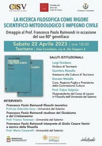 Si svolgerà questo pomeriggio, sabato 22 aprile, con inizio alle ore 18.00, presso la Sala Consiliare del Comune di Taurisano, l’evento dal titolo “La ricerca filosofica come rigore scientifico-metodologico e impegno civile”, realizzato per festeggiare gli 80 anni di Francesco Paolo Raimondi, storico Preside del Liceo Vanini di Casarano,