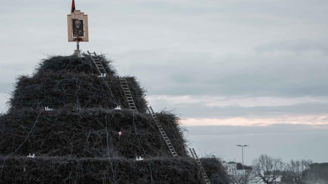 Tutto comincia nel silenzio delle vigne. Migliaia di tralci, ormai secchi, vengono raccolti e legati in fascine. Sembrano scarti, ma nelle mani dei maestri novolesi diventano mattoni di un monumento invisibile. Anche quest’anno la Focara dedicata al patrono è pronta in tutta la sua maestosità: 20 metri di altezza per 20 di diametro. Il monumento di arte e artigianalità contadina è stata costruita ‘intrecciando’ 30mila fascine di tralci di vite, abilmente poste una sull’altra da mani esperte. Ogni fascina racconta una storia, ogni scintilla che si alza nell’aria è memoria e promessa di rigenerazione. È qui che risiede la magia: saper trasformare lo scarto agricolo in un’opera d’arte che, per esistere davvero, deve scomparire tra le fiamme.