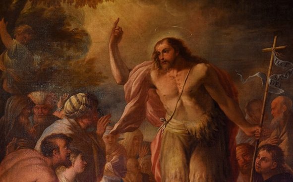 La prima tela raffigura La predica di San Giovanni Battista ed è un’opera proveniente dalla chiesa del Gesù o del Buon Consiglio di Lecce. Prima del restauro, la tela versava in pessime condizioni ed era in stato di abbandono. L’opera è stata realizzata dal pittore mesagnese Luca Paciolla nel 1685, ed è un’opera di alta qualità artistica. Attualmente la tela è esposta nel museo, ma non nella sua collocazione definitiva. La posizione provvisoria consente di apprezzare il lungo lavoro di restauro che è stato eseguito.