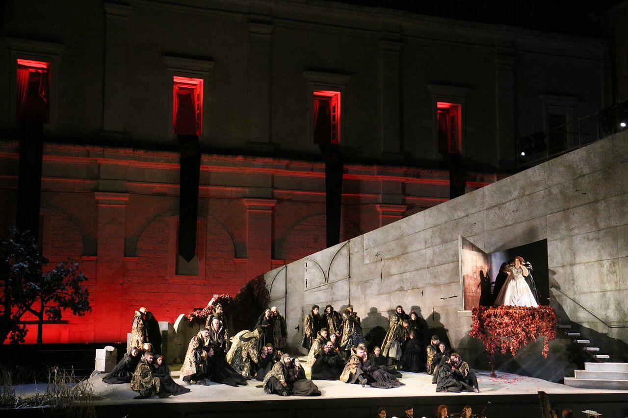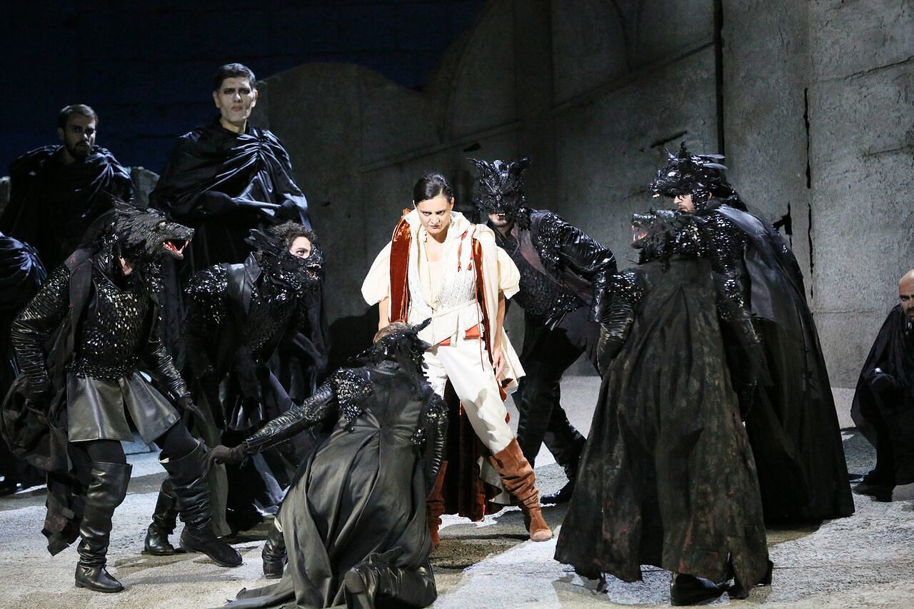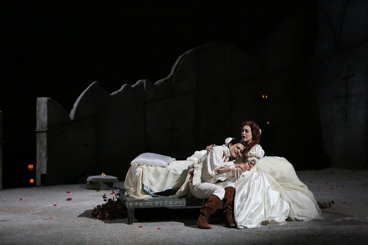 La guerra tra le famiglie Montecchi e Capuleti e l’amore contrastato dei due giovani Romeo e Giulietta, di opposte fazioni, sono la trama narrativa per il compiersi della storia con il noto finale tragico della morte dei due amanti. Il libretto di Romani,ambientato a Verona nel XII secolo,non ci racconta l’inizio dell’amore ma concentra il dramma dalla prospettiva dei Capuleti. L’apertura dell’opera è affidata ad un preludio e rapidamente ci troviamo catapultati nel dramma con l’arrivo del coro maschile, i neri armigeri, riunito da Cappellio, padre di Giulietta, interpretato dal tenore Leonardo Cortellazzi. Segue un concertato a quattro tra Cappellio, Tebaldo, il promesso sposo di Giulietta, il basso VasaStajkic, Lorenzo, medico e parente di Cappelio, il basso Christian Senn, e Adele madre di Giulietta, il soprano Paoletta Marrocu. C’è agitazione e preoccupazione per le nozze imposte tra Giulietta e Tebaldo. Arriva l’ambasciatore dei Montecchi e nessuno sa che è proprio Romeo, il contralto Raffaella Lupinacci, l’uccisore del figlio di Cappellio, che avanza la proposta di nozze tra membri delle due famiglie per suggellare la pace. Netto e tragico il rifiuto “Barriera eterna è posta, Tra noi di sangue, e non sarà mai tolta” e nel dramma si configura la tragedia con il coro ormai in assetto guerresco. La madre Adele entra con una lenta cavatina che ridimensiona il ferro e il fuoco, e lascia il tempo di preparare il duetto d’amore tra Romeo e Giulietta, aiutati dal fidato Lorenzo a incontrarsi, che si conclude con la promessa di amore eterno o morte. Scoperti gli amanti, si accellerano le nozze, Romeo vi partecipa e viene fermato nella fuga. Finale concitato del primo atto in cui prendono parte i personaggi tutti e il coro.