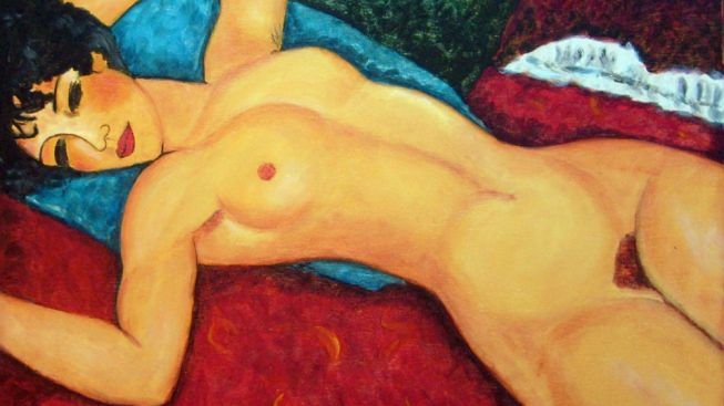 La scelta di Modigliani è già sintomatica: un pittore che sintetizza il clichè maudit per la sua biografia tormentata, terminata troppo presto per tbc, nei suoi amori disastrosi, nello scandalo che suscitò con i suoi giganteschi e totemici nudi; è proprio il nudo di donna su cuscino blu, realizzato in due versioni dall’artista nel 1916, e nel 1917, fece scalpore per la sua accogliente carnalità, per il particolare dei peli pubici ed ascellari, per l’esplicita e sensuale profferta dell’erotismo femminile.