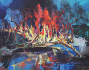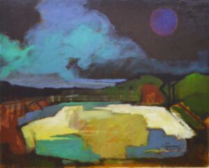 Osservando le opere in mostra e in generale il corpus di dipinti dell’artista concepiti tra i Settanta e il decennio successivo, si avverte una costante forza propulsiva legata alla genesi stessa delle immagini, come se ogni visione fosse frutto di un vero e proprio combattimento tra linee-forza (e il ricorso a un punto cardinale essenziale del Futurismo deve essere inteso come uno dei principi del fare pittura per Carlo Toscano, poiché saranno le avanguardie storiche tra le principali fonti del lessico visuale del pittore), spesso veementi, altre rallentate da una premeditata stesura che evidenzia increspature, sovrapposizioni, affiancamenti arditi. Toscano è un pittore di sogni e incubi, le sue case non stanno mai in piedi, volontariamente le struttura con pareti storte e a volte senza il tetto; sono d’altronde pretesti, formali ed esistenziali, poiché ribadiscono un altro dei punti cardinali del suo lavoro: l’uomo. Talvolta nella scomposizione di certi alberi e di certi campi di grano dai gialli smaglianti sotto cieli tragici e disfatti, Toscano aderisce a echi cubisti (nelle nature morte con chitarra c’è certamente un riferimento al Braque cubista); altre volte, soprattutto nei paesaggi alberati con attorno distese brulle di campagna salentina, riecheggia la pittura di un maestro di primissimo piano della storia dell’arte meridionale, Nino Della Notte.