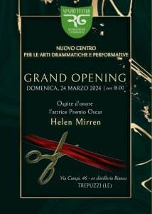 Taglio del nastro con l’Ospite d’Onore dell’evento l’attrice britannica e “Premio Oscar” Helen Mirren, che con grande entusiasmo ha deciso di accettare l’invito delle sorelle Giurgola e di prendere parte alla serata che segna il via per la nuova vita della scuola che attualmente conta 45 allievi provenienti da diversi comuni del nord e del sud Salento, iscritti a corsi di recitazione, teatro-danza, canto, musica e scenografia.