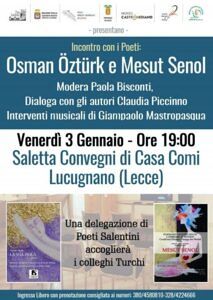 Si svolgerà domani, venerdì 3 gennaio, alle ore 19.00, presso Casa Comi a Lucugnano, frazione di Tricase, l’incontro con i poeti turchi Osman Ozturk e Mesut Senol.