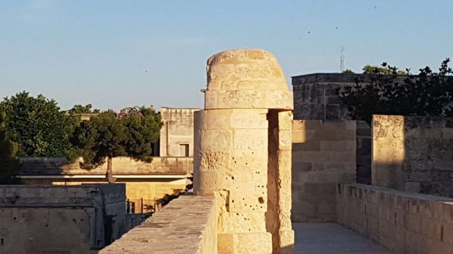 All’interno di ciascun bastione della “tenaglia”, una casamatta con postazioni di difesa strombate all’esterno sui fianchi di ciascun bastione, 6 troniere alla sommità per il lancio di difesa, 3 sulla cortina mentre le aperture sono assenti verso l’esterno in ciascun bastione. Non molte le concessioni all’estetica, come si conviene ad un ambiente difensivo: sottolineo tuttavia la firma dell’architetto Gian Giacomo dell’Acaya nello splendido capitello triplice rovesciato, all’interno dell’ambiente con triplice arco a tutto sesto. Sono emerse molteplici stratificazioni archeologiche come il rinvenimento di una strada romana del IV secolo, che collegava Lecce a Brindisi e alla via Appia, ed un tratto di fortificazione di età federiciana, oltre a tracce di graffiti come il cavaliere inciso sulla muratura esterna, tanto somigliante ad un ritratto di Carlo V di Tiziano, e all’interno nel vano superiore un tetragramma musicale con una dozzina di note, unitamente a croci, numeri, stemmi. Ricordiamo che l’ambiente ebbe un uso militare e carcerario fino al ‘900 e i restauratori hanno lasciato all’esterno una garitta che ricorda l’antico utilizzo. E’ stato rinvenuto vasellame risalente tra il IV e il III sec. a.C., frammenti lapidei databili tra il XVI e il XVIII secolo, oltre a reperti più recenti sette-ottocenteschi.