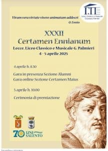 La giornata inizierà con il “Certamen Ennianum“, una competizione di traduzione dal latino che metterà alla prova le abilità di studenti del Liceo (sezione Alumni) e di altri licei italiani (sezione Certamen Maius). La traccia di quest’anno, “virum vera virtute animatum addecet” (Si conviene ad un uomo vivere animato da una vera virtù), ispirata al celebre motto di Ennio, sarà valutata da una commissione di esperti dell’Università del Salento (la Commissione sarà guidata dalla prof.ssa Natascia Pellè con i proff. Alessandra Manieri e Alessandro Capone insieme ad assegnisti e dottori di ricerca).