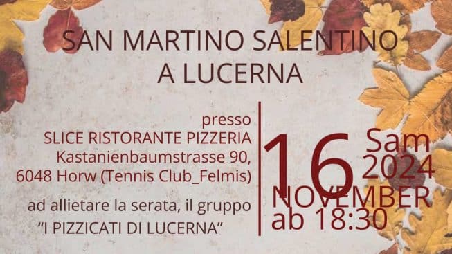 Il profumo del mare, il sapore della terra, la gioia della musica e la convivialità di un tempo: tutto questo e molto altro si respirerà a Lucerna sabato 16 novembre, quando la comunità salentina residente in Svizzera si riunirà per celebrare la tradizionale festa di San Martino.