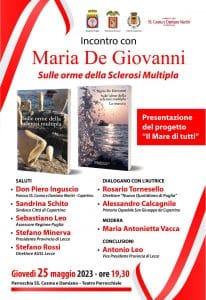 Un percorso professionale e umano che è diventato con forza e determinazione un cammino per una vita nuova. Un fascio di luce su uno snodo importante di vita, al tempo stesso punto di arrivo e punto di partenza, quello che regalerà Maria De Giovanni, giovedì 25 maggio, a Copertino, alle 19.30, presso il teatro della parrocchia Santi Cosma e Damiano. Un appuntamento durante il quale la nota autrice salentina, attraverso i suoi libri “Sulle orme della sclerosi multipla” e “La Rinascita”, racconterà come il suo difficile percorso sia diventato autentica testimonianza.