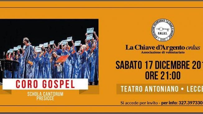 Durante la serata è in programma l’esibizione del Coro Gospel Schola Cantorum di Presicce che propone interpretazioni e brani della tradizione internazionale. La manifestazione ha la finalità di raccogliere fondi a sostegno delle attività che i volontari della Chiave D’Argento svolgono ogni giorno presso il Polo Oncologico Giovanni Paolo II di Lecce.